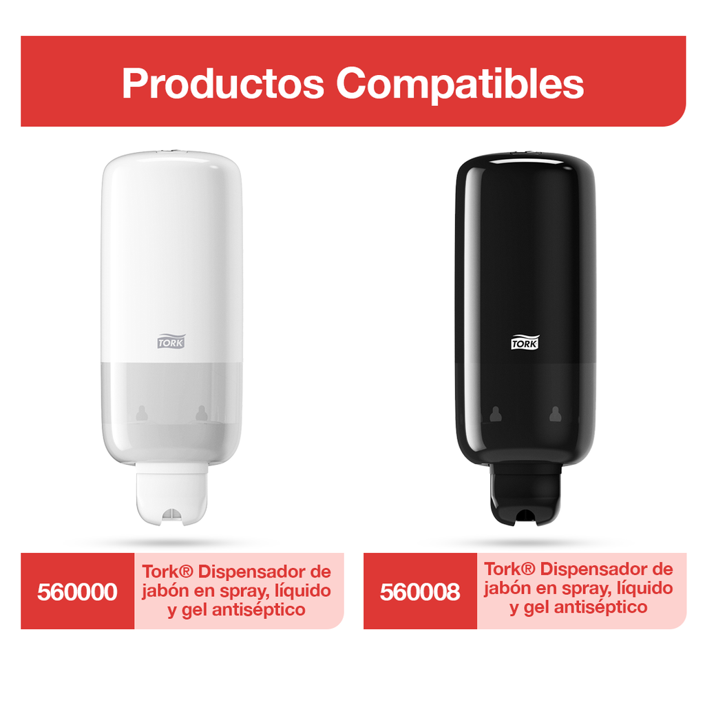 Adecuado para dispensadores de jabón líquido y en spray Tork (S1/S11), con certificado 'Easy to use' (fácil de usar) que hacen más accesible la higiene de manos a todo tipo de usuarios.